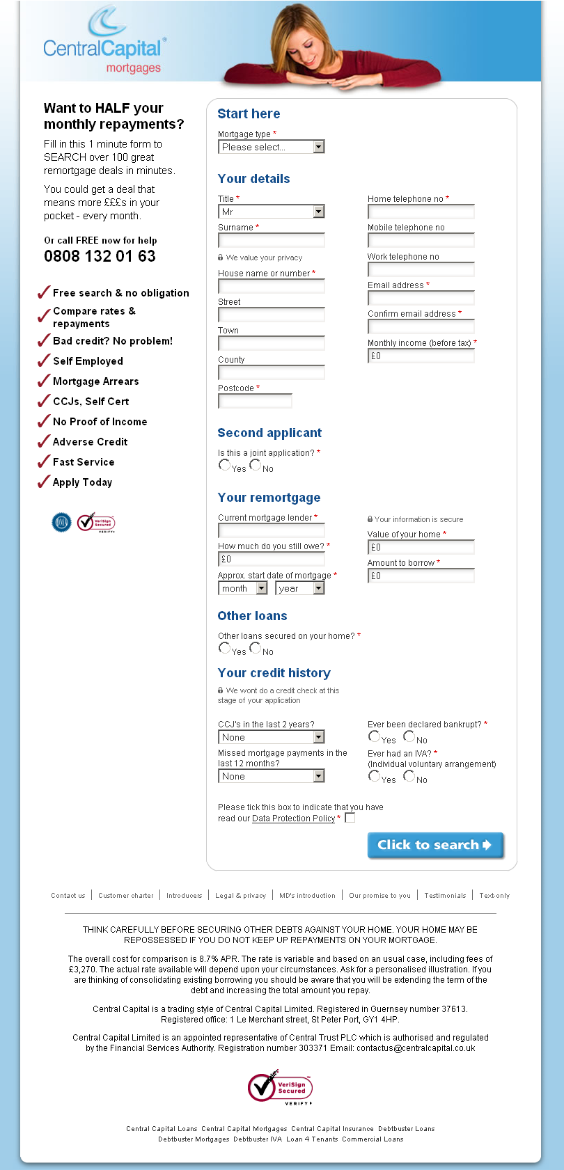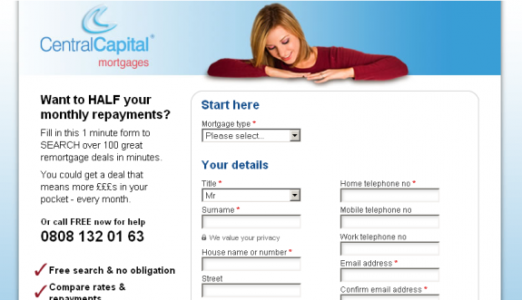 The Central Capital Mortgages site has been running for a number of years with limited profitability. My redesign has made huge improvements and at present other marketing campaigns have been suspended to concentrate on PPC as it has become the most profitable channel for the business. The site went live Jan 2007. This new design went live 26th Jan 2006 and had an immediate impact, with the conversion rate moving from 3.3% to 7.7% on the remortgage PPC keyword on google. The site featured a single long form rather than several shorter pages, images were used sparingly only to direct the user to the form and it used shorter copy than previous versions of the site. Also the site removed the normal navigation features (such as a home link) which we believe contributed hugely to this improvement.