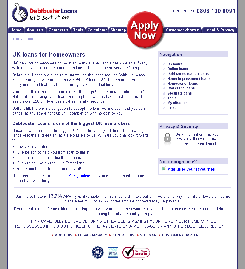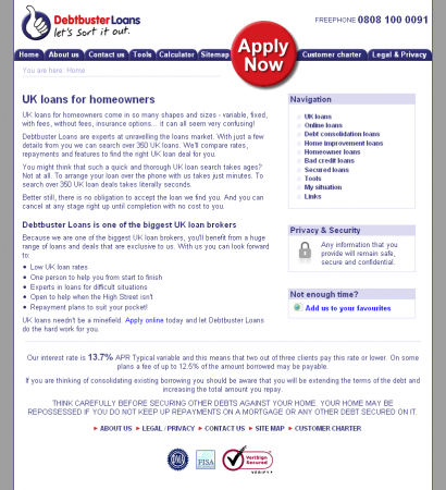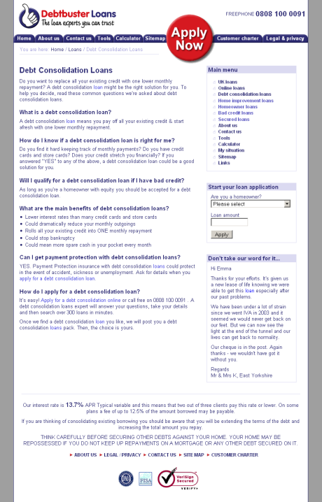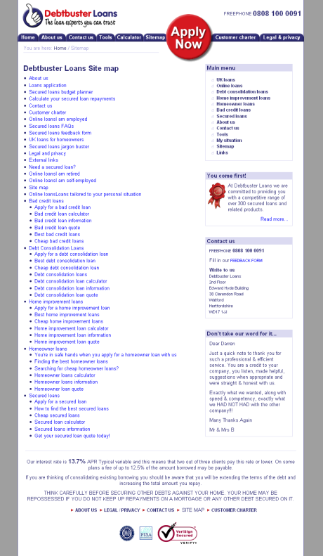 Until this release very little effort had been made to increase the sites visibility in natural search engines. This version of the site was used on all none landing pages and was more text based, it went live Sept 2007. http://www.debtbusterloans.com The homepage is optimised for the UK Loans keyword (loans by itself being extremely competitive) and the design is text-heavy and quite simple to allow spiders to crawl the site as easily as possible. Semantic HTML has been used and is styled using CSS, again to help the spiders. The site includes a number of interactive features such as the calculator, budget planner, feedback forms and application forms. The calculator takes it’s settings from an XML file and chooses an interest rate based on the loan amount selected and then does the calculations for the user. The site now includes a hierarchically structured set of authority pages, at the top level we are aiming for the keyword “UK loans”, then at the next level more specific keywords like “debt consolidation loans”, below that level other pages are even more specific versions in an attempt to get the maximum exposure on a variety of phrases within the search engines. the sites custom CMS also included a glossary system where specified keywords could be automatically picked-out within the site content and linked through to relevant pages, allowing for a much higher level of internal linking and linking within paragraph content rather than just menus. The sitemap mirrors the hierarchical structure of the authority pages, as well as the other pages in the site.