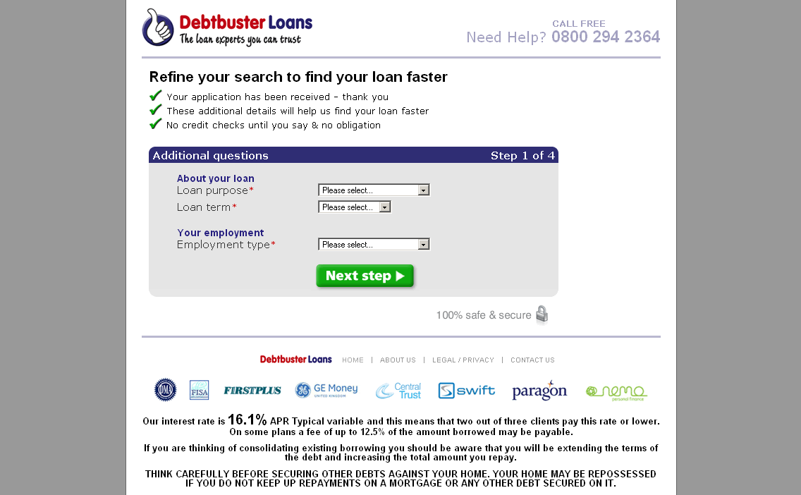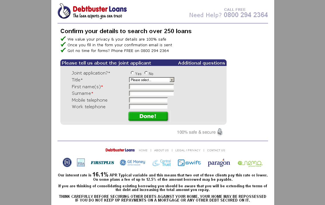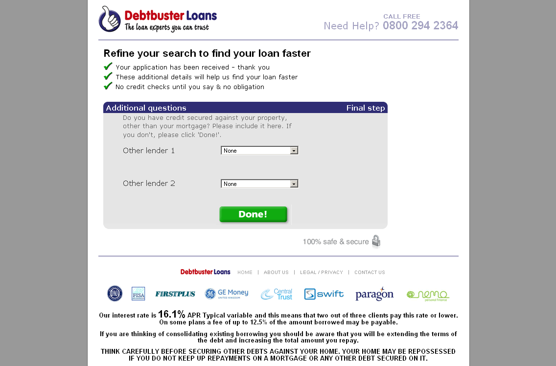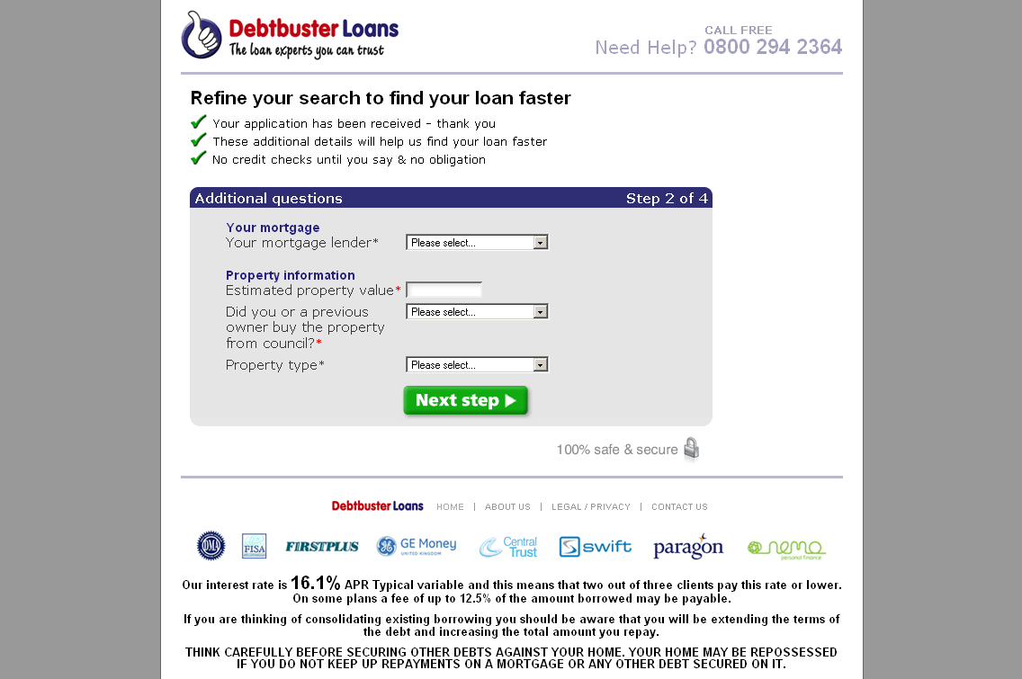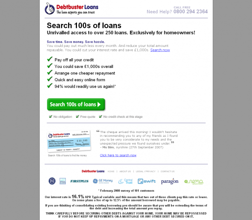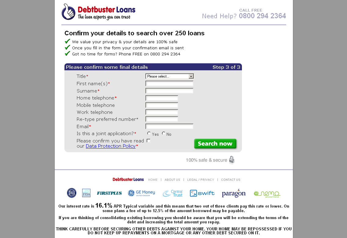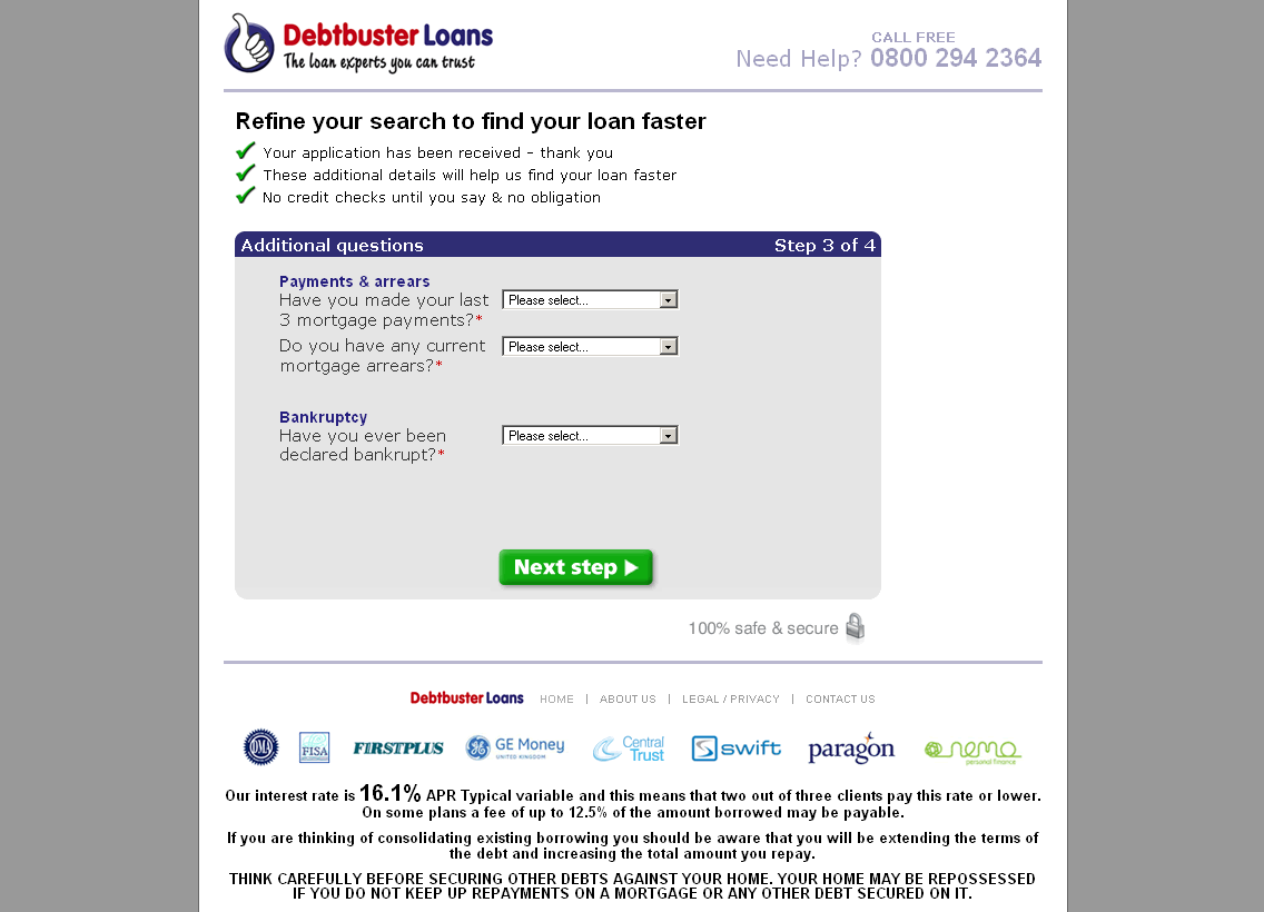 This design hopes to split the sales messages off onto a front page and then concentrate more on support and reassurance messages on subsequent pages. This design went live in Feb 2008 and so far has had mixed results. Click through rates once customers arrive on the app form are very good but the extra drop-off because of the “pre” page seems to be limiting it to similar performance to the current control design. We originally tested this page with a more sophisticated layout but in order to try and improve click through rate I redesigned it with a very simple, linear flow. Although this looks poor, the aim is to more accurately meet the customers thought process and to simplify their eye-flow down the page. Once the customer reaches the second page they arrive on the application for with our standard questions. This design is much less cluttered than the old designs and simplifies eye-flow by only using a single column. As usual page 3 is the final mandatory page. After collecting the DPA we can process the customers loan enquiry – subsequent pages help us process it more easily but are not needed. This design has the same questions as previous application forms (shown here in full) although this page breaks down the normal long page into a series of shorter chunks. This will be measured against the standard one page approach but currently not enough data has been collected.