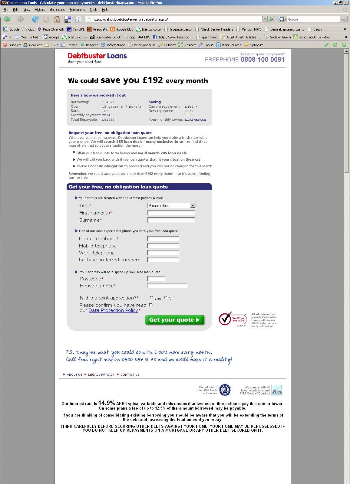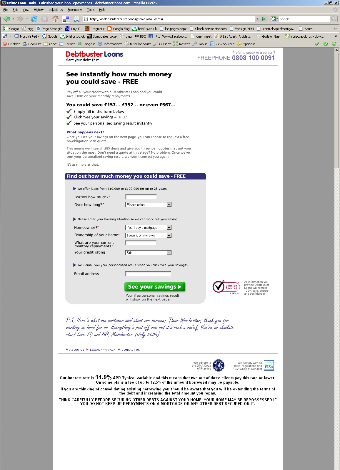 Here I descibe in detail my approach to taking a working control landing page and turning it into something all together more effective. My landing page optimization process, fully at work. The current “control†page The current landing page has evolved through vigorous AB split testing on PPC. We utilize our highest volume term for this testing, the “Loans†exact match keyword. We have very similar variations of this page for other terms – with the only difference being the header “Search 100s of loans, unrivalled access to 100s of loans, exclusively for homeownersâ€. This text exactly matches PPC display copy we use on the appropriate terms. We also use this page on a variety of banner and email campaigns – where this header section changes to match the message and graphics of the source media. Everything else on the page remains the same. This landing page is a three page application form, for the purposes of lead generation. We have tested single page and two page applications but neither beat this control. Motivation Our research has shown that approximately 80% of our customers take out a loan for debt consolidation. Our domain name contributes to this, yet we do not currently target our copy specifically at this market. The current thinking is that we can offer loans for any purpose and by targeting consolidation we will lose customers. We have attempted to address this by tailoring our core value proposition to a consolidation audience. Also by using a page with more copy, we hope to be able to address the concerns and meet the expectations of customers coming from different sources e.g. PPC customers are actively searching for a loan while banner customers were not. The optimized page is designed for use across PPC – “loans†keyword but also more specific “secured loan†and “debt consolidation†group terms. We will lead new PPC campaigns with a debt consolidation message – similar to the lead message on the new page design. Our current page requires three pages be completed. Our data is automatically processed and routed to different parts of our business depending on how the form is completed. We cannot currently change the questions we have to ask. We believe that users arriving on the first page are expecting an aggregator style loan search – an expectation which we cannot fulfill. We also believe that requiring a user to stick with a single process over three pages is asking a lot. On the optimized page we have drastically changed the “angle†that our app form takes. We have turned the first page into a detailed “savings calculator†targeted specifically at consolidation customers. By asking the certain questions up-front and including “current monthly repayment†and “credit rating†fields we are able to calculate how much money we can save the customer on a monthly basis. We have also included the email field (optional) at this stage. If they provide their email address then we will email them their saving quote – plus we can send a customer service email if they fail to complete page two. As our processing requires an email address for a full application we will need to ask for the email (mandatory) on page two if the user does not already supply it. We are trying to turn a process which spans three pages look like two separate processes, each of which are shorter and provide feedback to the customer. Value Proposition As our product (secured loans) is a commodity which differs very little from company to company – and especially as we are a broker offering exactly the same loans as other brokers – we have struggled to find a compelling value proposition. Our company has built itself on excellent customer service, highly efficient marketing and processing, which we realize are not unique enough to form a value proposition. Our current control uses our PPC copy as it”s value proposition “Search 100s of loans†which a number of our competitors also use in one form or another. We do not have the most loans, so we have decided to move away from this message. We have tried to differentiate between the first and second pages of the application in order to compel customers to disassociate it with a single, long form to fill-in. Our first page leads with the value proposition… See instantly how much money you could save every – FREE. This fits the new style app form, which will calculate the customer”s savings and display the result on the second page. The remaining copy on the page all tries to reinforce this message and explain what the user will get when they complete the form (this page). We have also tried to emphasize the fact that this is a totally none-committal stage in the process. The second page will calculate the customers saving and display an appropriate message (we will have a generic message if we cannot save them money e.g. the user fills in zero for their current monthly repayments)… We could save you £XXX every month. The second page leads with a saving we have calculated from the data the customer has provided. We hope this is a strong message to get them to apply for a further quote – something we try and emphasize in the remaining copy on this page. Friction Several major areas of friction were identified on the current page. Number of questions Unfortunately this cannot be changed as these questions have been integrated into a rules engine for prioritizing and segregating our leads. Hopefully this has been alleviated on the optimized page by splitting the process into two separate forms – each of which has a clearly identified result for the customer. Difficulty of questions Some of the questions have relatively easy to misunderstand answers – such as are you a homeowner: yes, no, yes – but I don”t pay a mortgage. We have set default values where appropriate on the form in the optimized page but we cannot change these questions. Eye flow The eye flows from the logo (which is oriented in