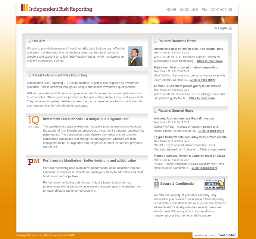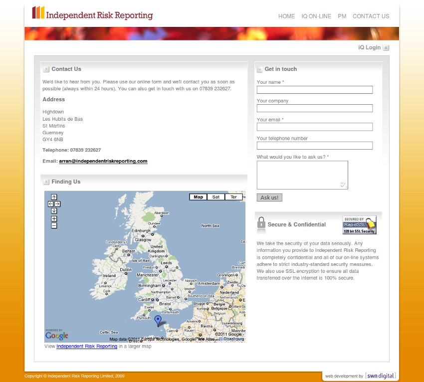 Independent Risk Reporting was a two-part project, firstly to create a simple informational homepage and contact for the client and secondly to create a risk reporting questionnaire system, this brief port covers the brochure website that was created with PHP and the Smarty framework. The site needed a clean and professional design and the homepage was relatively information heavy, including RSS news feeds from Reuters. The contact information page was seen as a key to the success of the site and time was spent making sure information was clearly presented, the contact form worked well and a google map was included. See the screenshots below, or take a look at the live website.