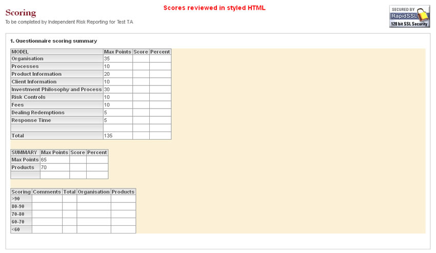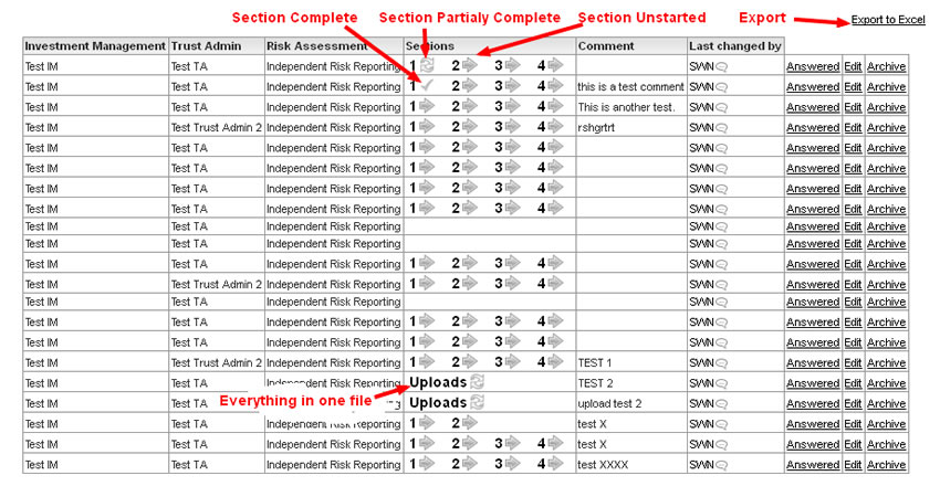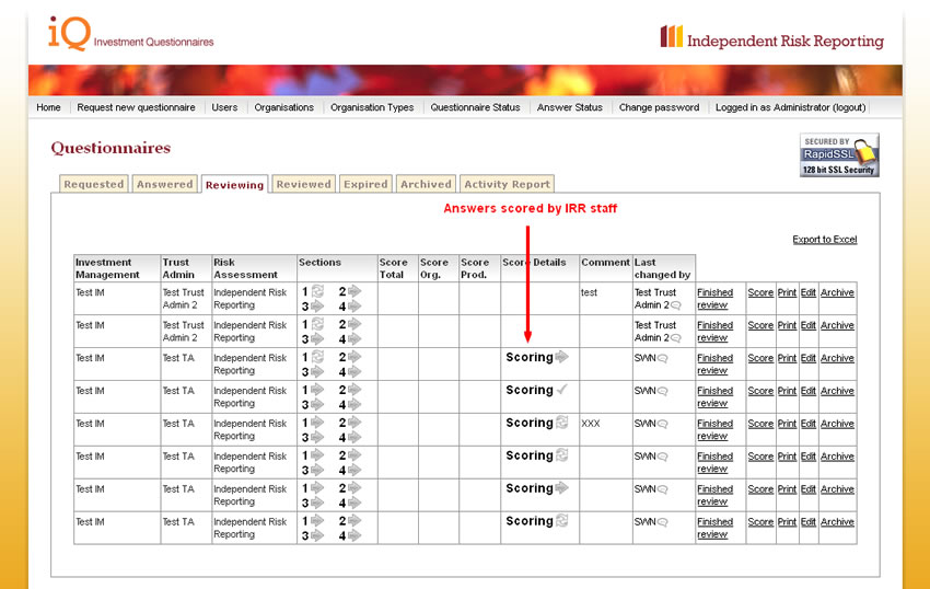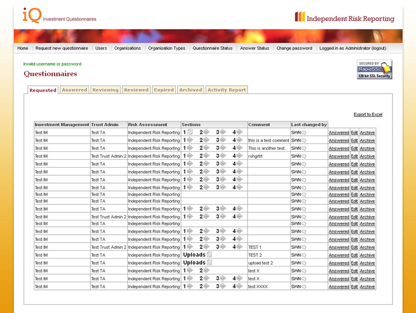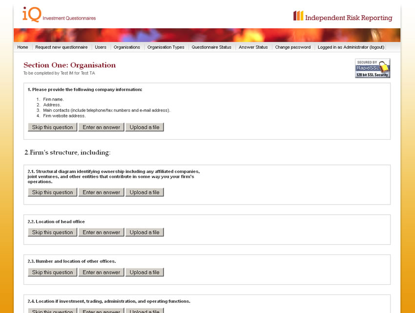 This project was to build an online system with various user roles for requesting, completing and reviewing risk reporting questionnaires. Ruby on Rails seemed the best framework to use for this and a lot of the system simply uses styled versions of the standard Rails scaffolds. The core functionality of the system was to track the workflow of risk questionnaires and these are presented in a series of tabs, each tab containing a table of questionnaires in that “state”. The questions were then asked in sections, all of which could be dynamically put together with specific questions. Each section contains a list of questions, with the answer being given as “skipped”, a freeform text answer or a file uploaded. These questions were all answered, changed and saved using AJAX to enable a fast and simple experience for the users. Once the sections of the questionnaire are completed the answers can be reviewed and a further section is put together to score them. The scoring section uses the same format with AJAX questions and includes HTML templates for the answers that are easily edited within the text editor box. The key to all of this was security and ensuring various parties were only able to access their own information, and that parties could only edit questions from the correct state in the workflow.