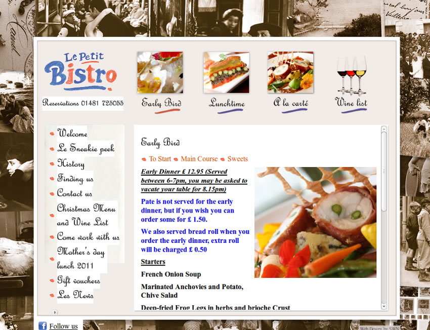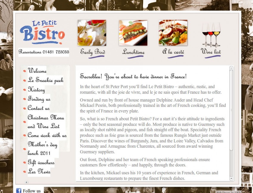 This project was to provide a simple to use wordpress site that conveyed the ambiance of Le Petit Bistro Guernsey to both customers and potential staff. The site was put together using several custom wordpress templates that included plenty of embedded video, graphics and even an mp3 sound track. The site was received well and we subsequently added a companion site for Le Petit Cafe. You can see the [website here][1]. [1]: http://www.petitbistro.co.uk