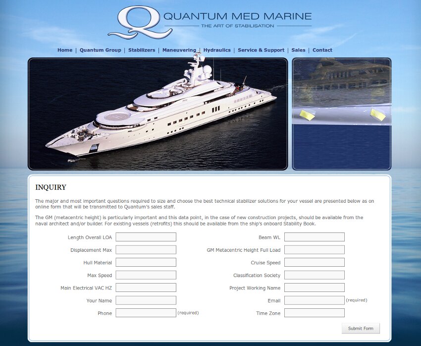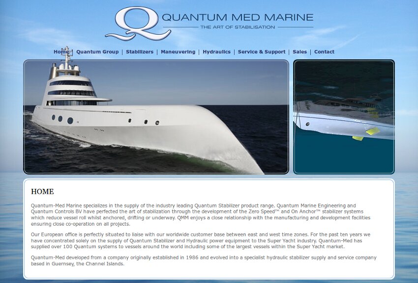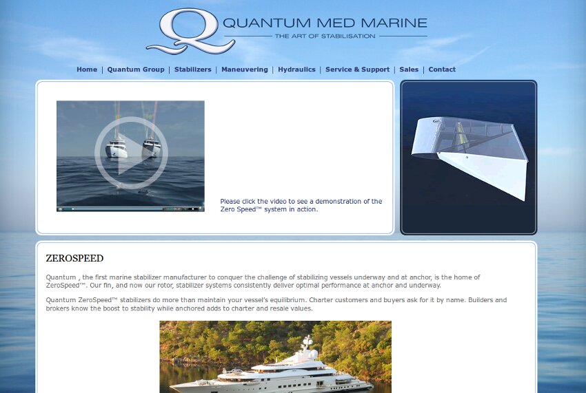 This website build was a WordPress site built to a design put together by our in-house designer and included JavaScript fading images and pop-up windows for video, for which we used flowplayer. The site design had a few complicated elements, mainly the JavaScript fading images that needed to fade in-sync with each other (the ship masts overlap on some images etc.). We achieved a really professional looking site and everyone involved was pleased with the results. About Quantum Med Marine For 15 years Quantum has set the global standard for innovative yacht technology. In 1999, Quantum invented and implemented the first successful dual-purpose roll stabilization system, trademarked as ZeroSpeedâ„¢. This feat of engineering forever changed the yachting world by stabilizing the rolling motion of almost any vessel not only when underway, but also when anchored or drifting.