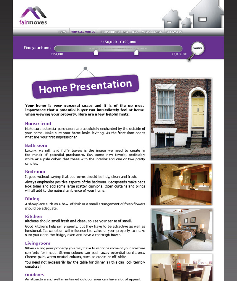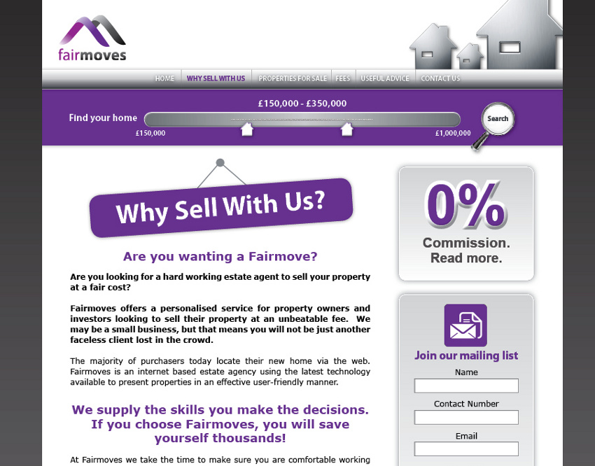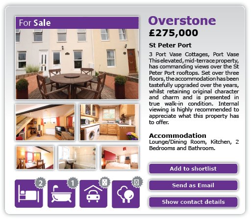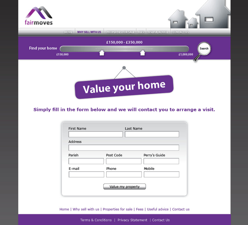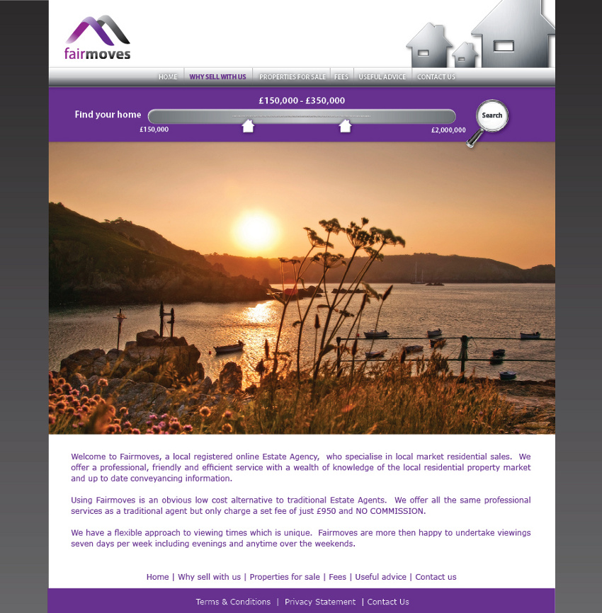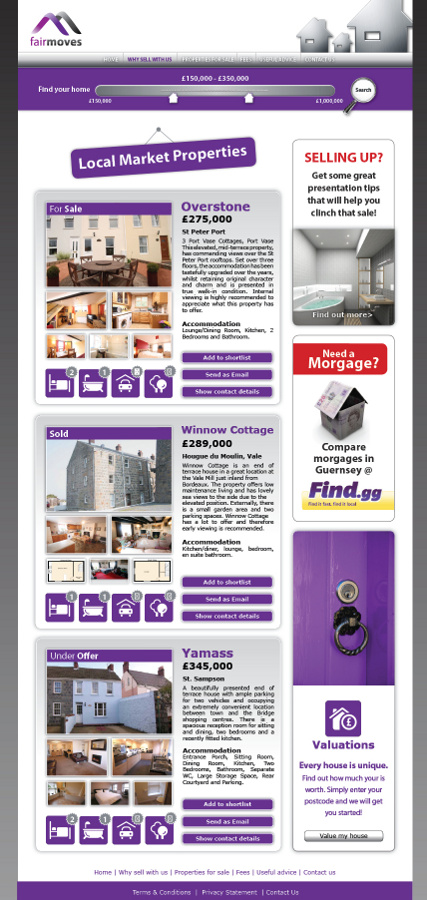 Fairmoves was a website for a startup estate agent in Guernsey, the project gave me the chance to write a Ruby on Rails application and involved a really slick integrated design. The design used a simple informational front page with a scriptaculous slider control that allowed users to select a price range to view on the property listing page. The listing for each property was put together from highly structured database fields that allowed for some slick graphics indicating the number of bedrooms, bathrooms etc. The remaining pages of the site were all built to the carefully crafted design and were received well by everyone who saw them. Unfortunately the startup was a short-lived venture and the site is no longer available. Still, it provided a really good learning platform for myself and an oppourtunity to write some good code. See the screenshots below to view the site.