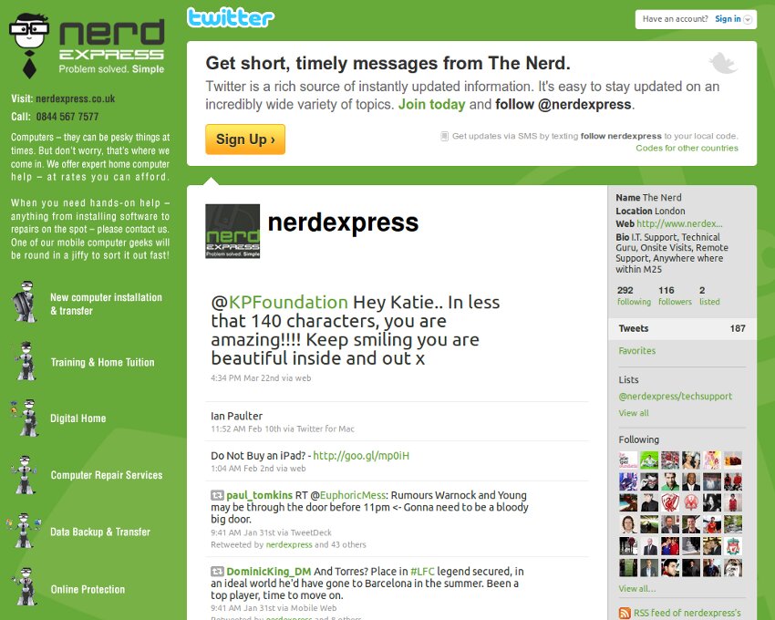 As the Nerdexpress company started to work more and more with twitter, Facebook and other social media they felt they should try to push their brand out onto these platforms as much as possible. I was able to help them by producing a background for twitter that was in keeping with the company’s branding and pushed the most important information about the company such as web address and contact details.