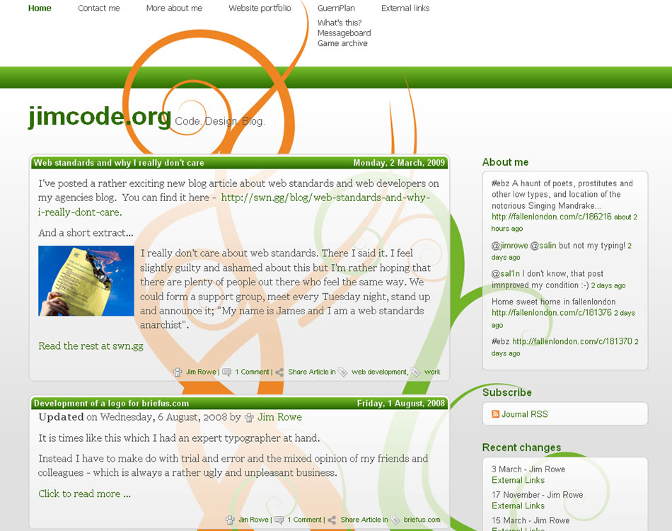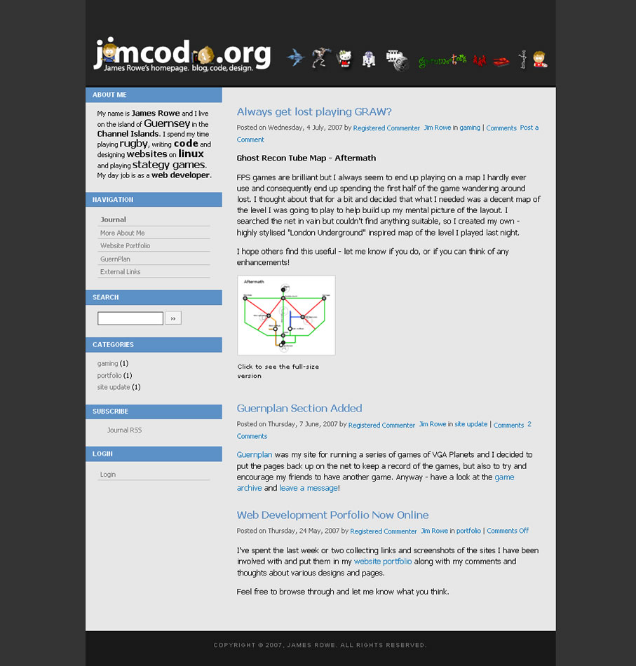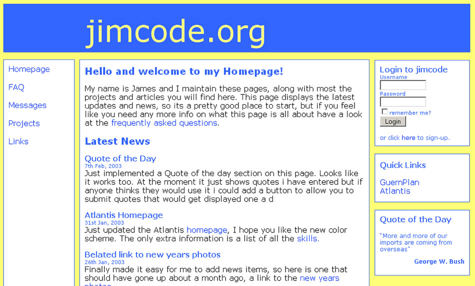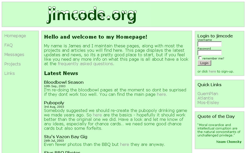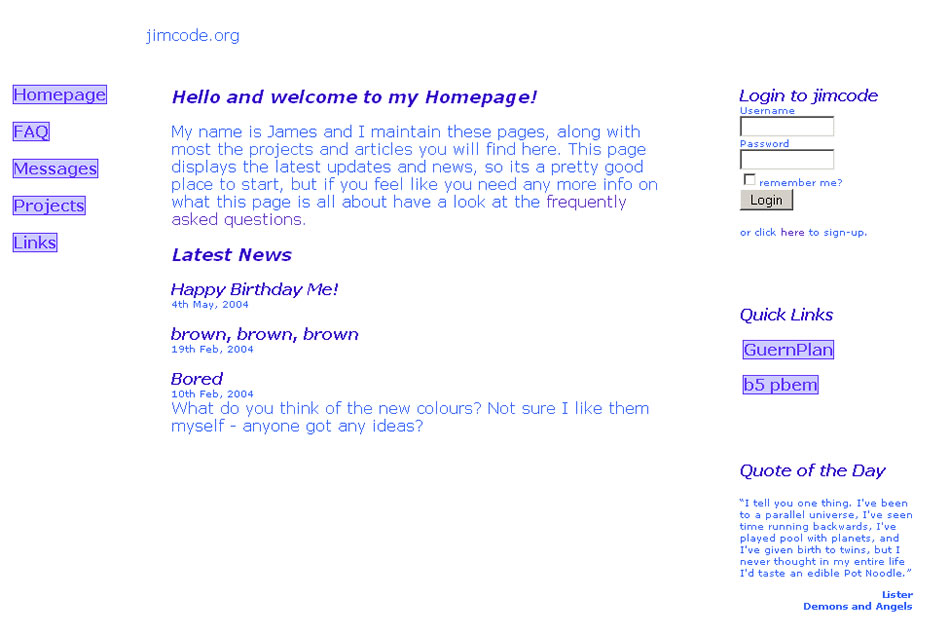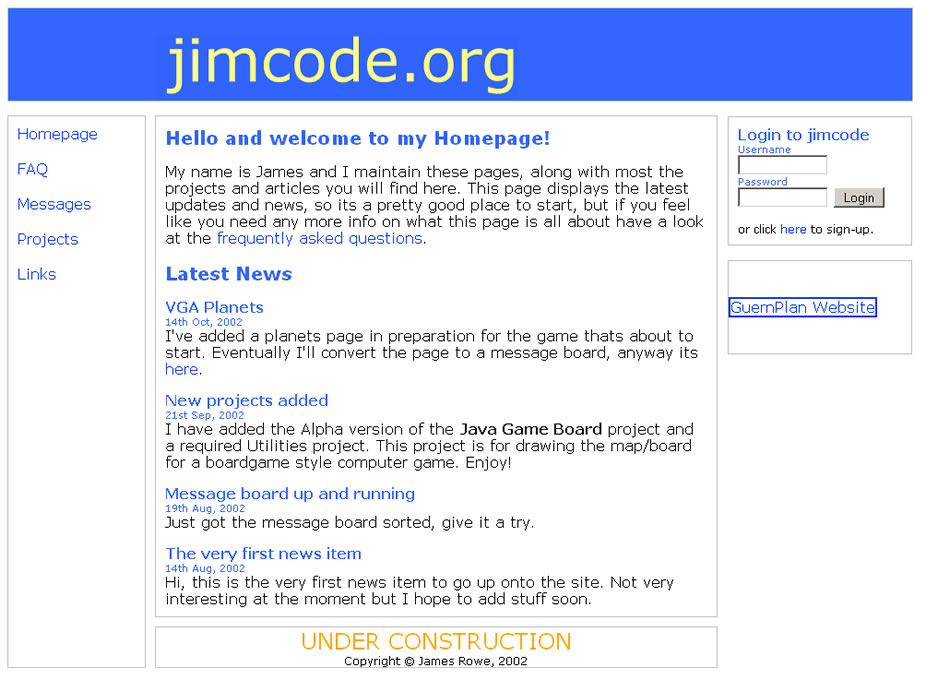 I look back at the early versions of my jimcode website and I cannot help but ask “what was I thinking?!”. Still, it has been around for a long time in one for or another. Originally it was static HTML and CSS, and probably some tables. I quickly developed my own templating system called wemplates using java – I will see if I can dig the code up for it and post on here one of these days. From there I started building bits of the site and associated mini-sites using PHP, most of which was very custom and a pain to keep maintained. Around 2006 I realised that a proper CMS was the way forward and built my own theme using SquareSpace. I kept using for a few years before moving to WordPress. I can’t see myself changing from WordPress in the near future but who knows. It would be great to see if I can resurrect some of the old PHP projects I used to host before the move to SquareSpace – we will have to see. Anyway, here are a few screenshots – starting in 2002!
