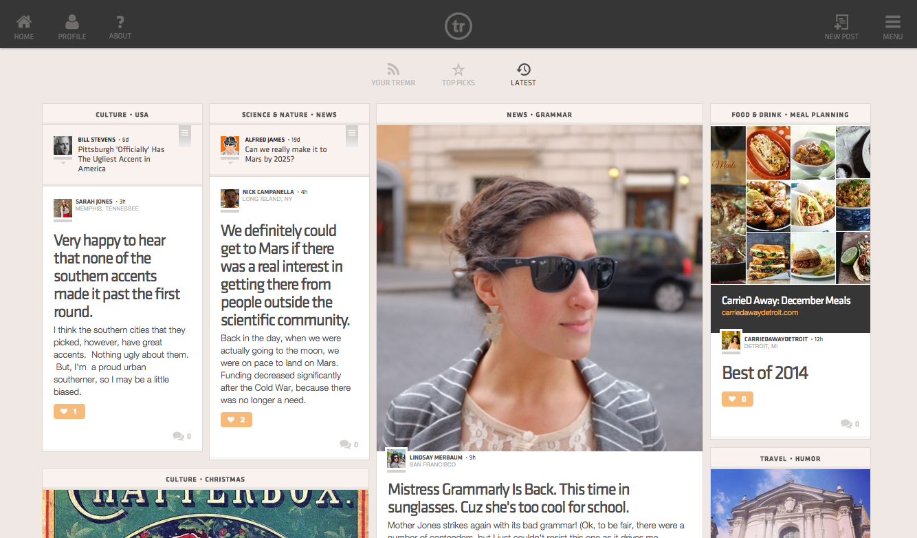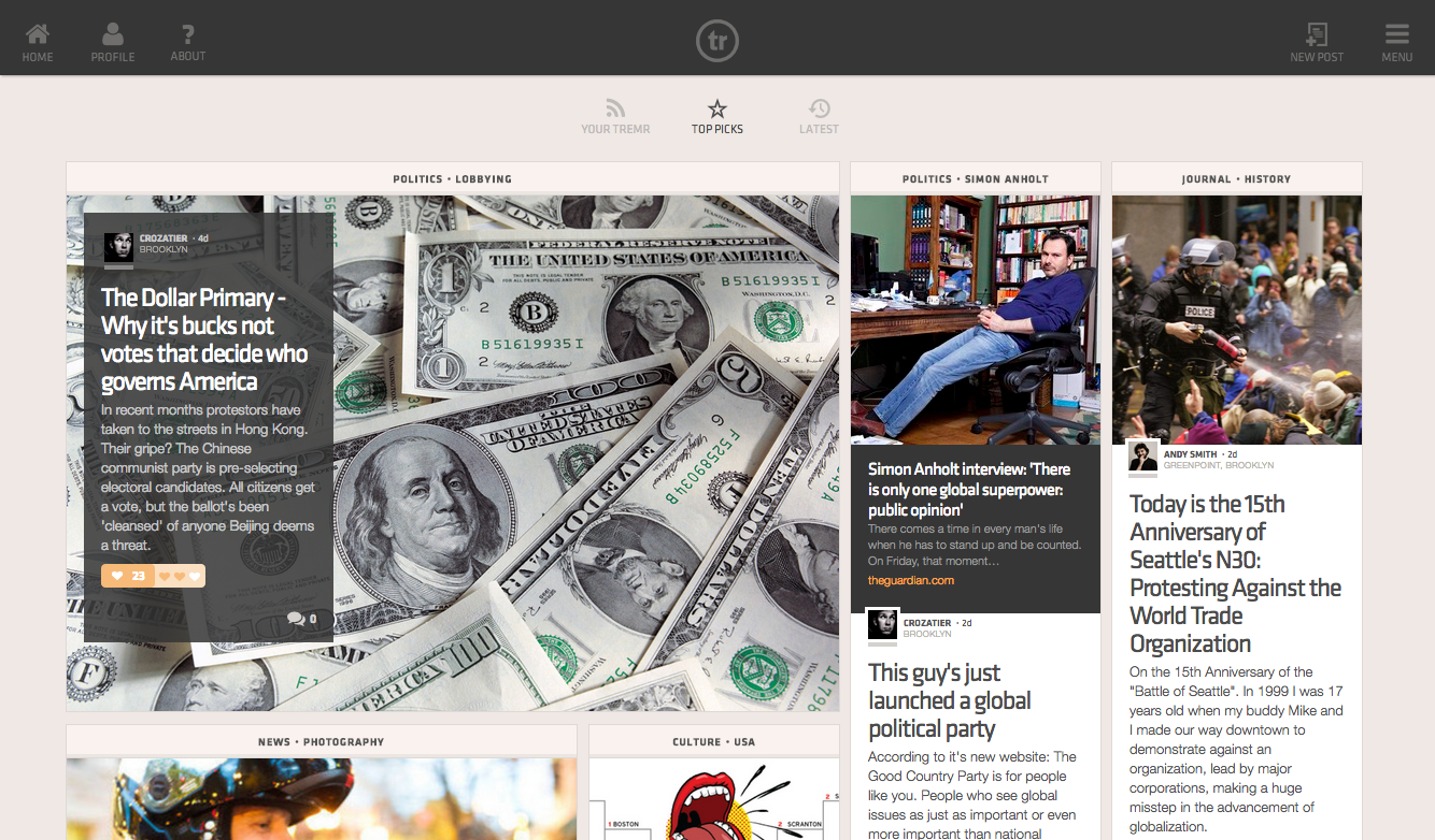 Well, it’s been a busy year working on tremr, I finally found the time to write a little bit about it here (as a way of avoiding working on version 2!). Tremr is a social blogging platform aimed at citizen journalism and the more serious and grown-up side of the Internet. Take a look: We have planned out so many features and we are yet to implement or even prioritise all of them but I think the three key points are these: Blogs are better when they are social More content from more contributors and the ability to critique and discuss is always better than contributors acting alone in isolation. We believe in playing on the strengths of the world wide web and that means sharing content and increasing communication, we don’t believe that everyone owning their own domain name and relying on google to find content is the best way to use of the Internet to share knowledge and discuss opinions. Content isn’t always original The hardest think of all in creating content is getting started. We believe that there is a huge amount of potential in that half-thought idea or that initial gut reaction you have to somebody elses content or opinion and we want to give you way to express that. It should be easy to add small snippets of content as part of, or starting, a wider debate. Control over how you discover content We don’t think our algorythms can make better decisions about the content you want to see than you can. We want to give you control over the content that is suggested to you on your tremr page as well as the tools to go and discover the best content yourself by using rankings, ratings, sorting and filters. A lot of that vision is coming in version 2, early next year. In the mean time we have made a good start at www.tremr.com.